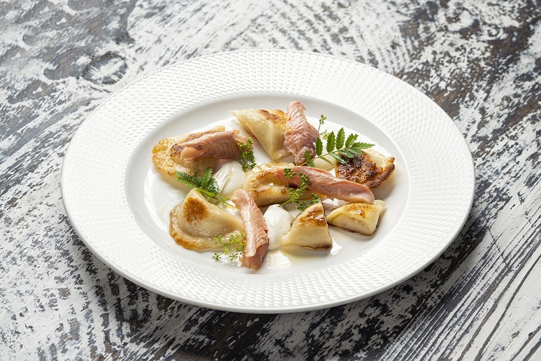 PIEROGI Z ZIEMNIAKAMI, WĘDZONYM PSTRĄGIEM I WĘDZONĄ ŚMIETANĄ